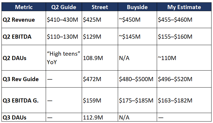 To be fair, I don’t have a great read on Q3 yet — seasonality and DAU growth is all over the place. But one thing I’d note is Citi recently pointed out July DAU trends have been stable M/M, so I’m personally fine with the 3% Q/Q growth estimate. In fact, I’d prefer if street expectations come down, so the setup gets easier to beat.